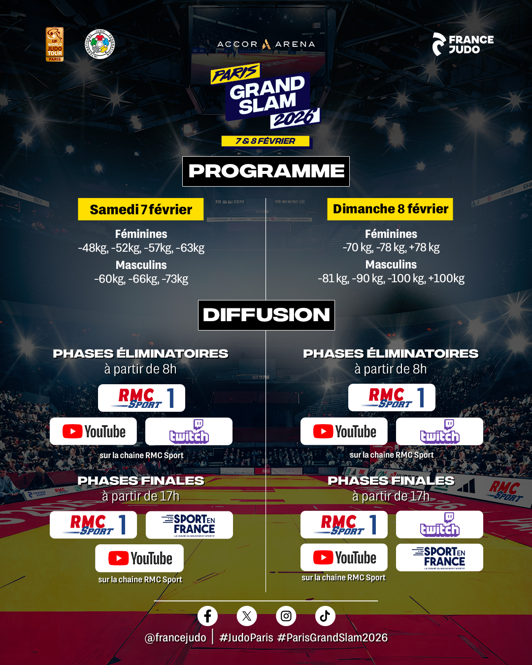 Partenaire officiel de la fédération internationale et de France Judo, RMC Sport retransmettra en direct les deux journées de compétition, qu’il sera également possible de suivre sur la plateforme Judo TV. La chaîne Sport en France diffusera les phases finales samedi et dimanche.