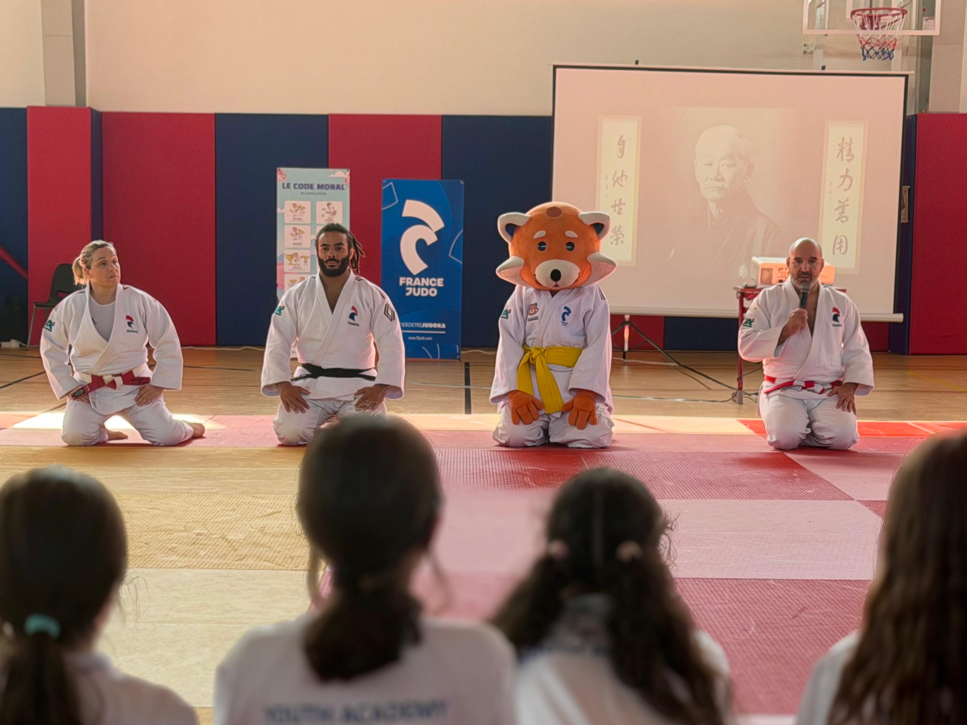 Pour porter ce message, plusieurs champions et figures emblématiques du judo ont accompagné ce déplacement : Larbi Benboudaoud, Hélios Latchoumanaya et Barbara Harel, aux côtés de Kodomo, mascotte de France Judo.