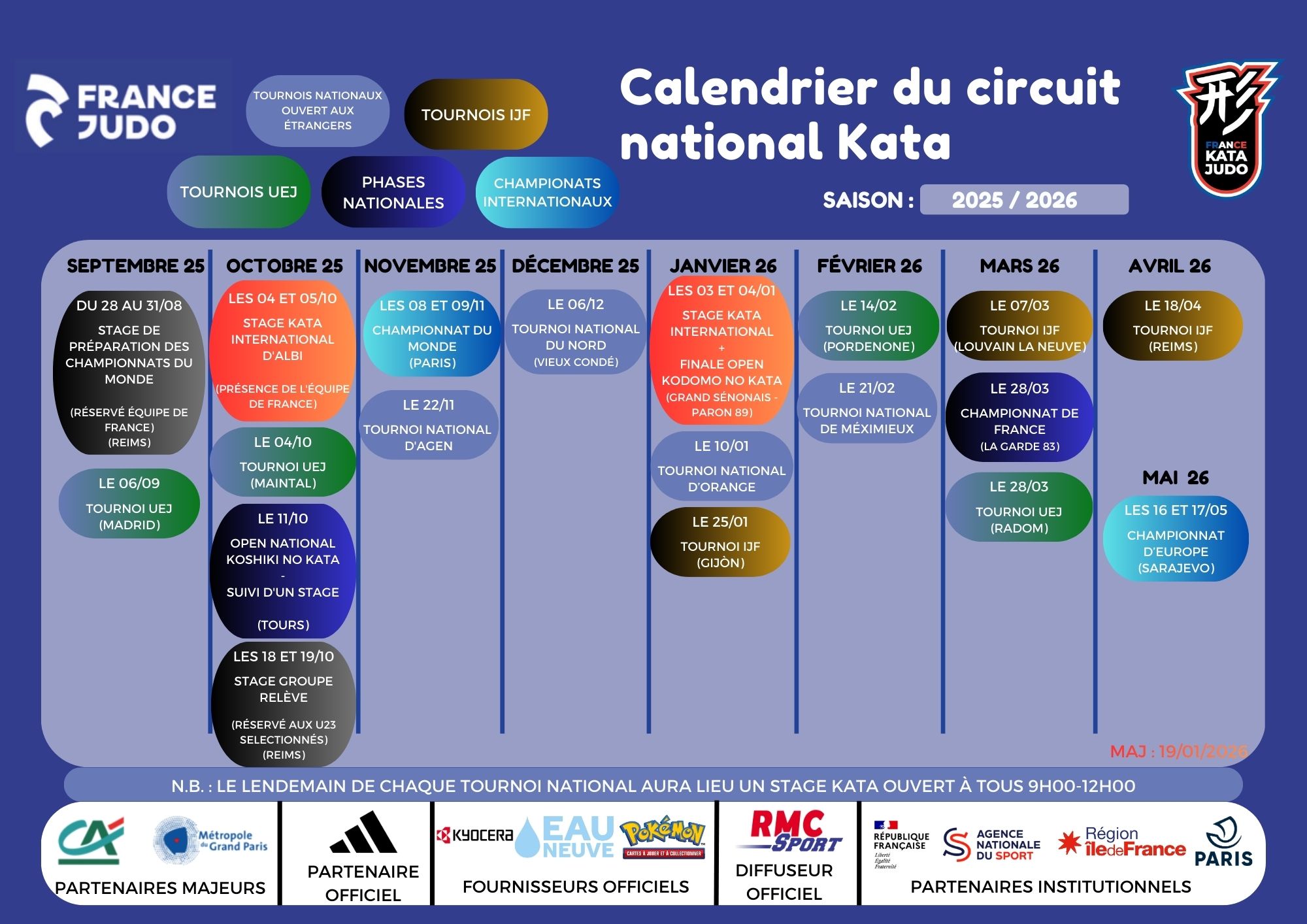 Le lendemain des cinq tournois labellisés du circuit National, se déroule un stage ouvert à tous, encadré par des membres de l’équipe de France et des experts formateurs nationaux et locaux. Ces actions de proximité, ont pour objectif de se perfectionner dans la pratique du kata en profitant des conseils avisés des membres de l’équipe de France.